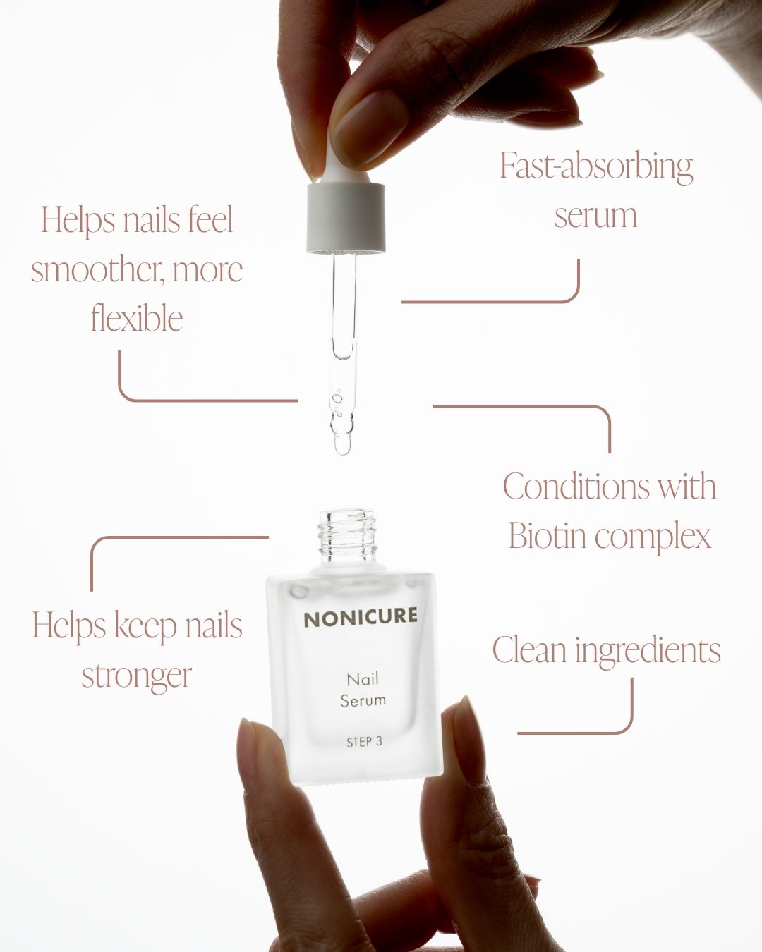 Step 1 of the Nonicure™ System. Apply Nail Strength Serum to bare nails. Let dry fully. Use consistently between gel sets to prevent damage and maintain strong, healthy nails.
