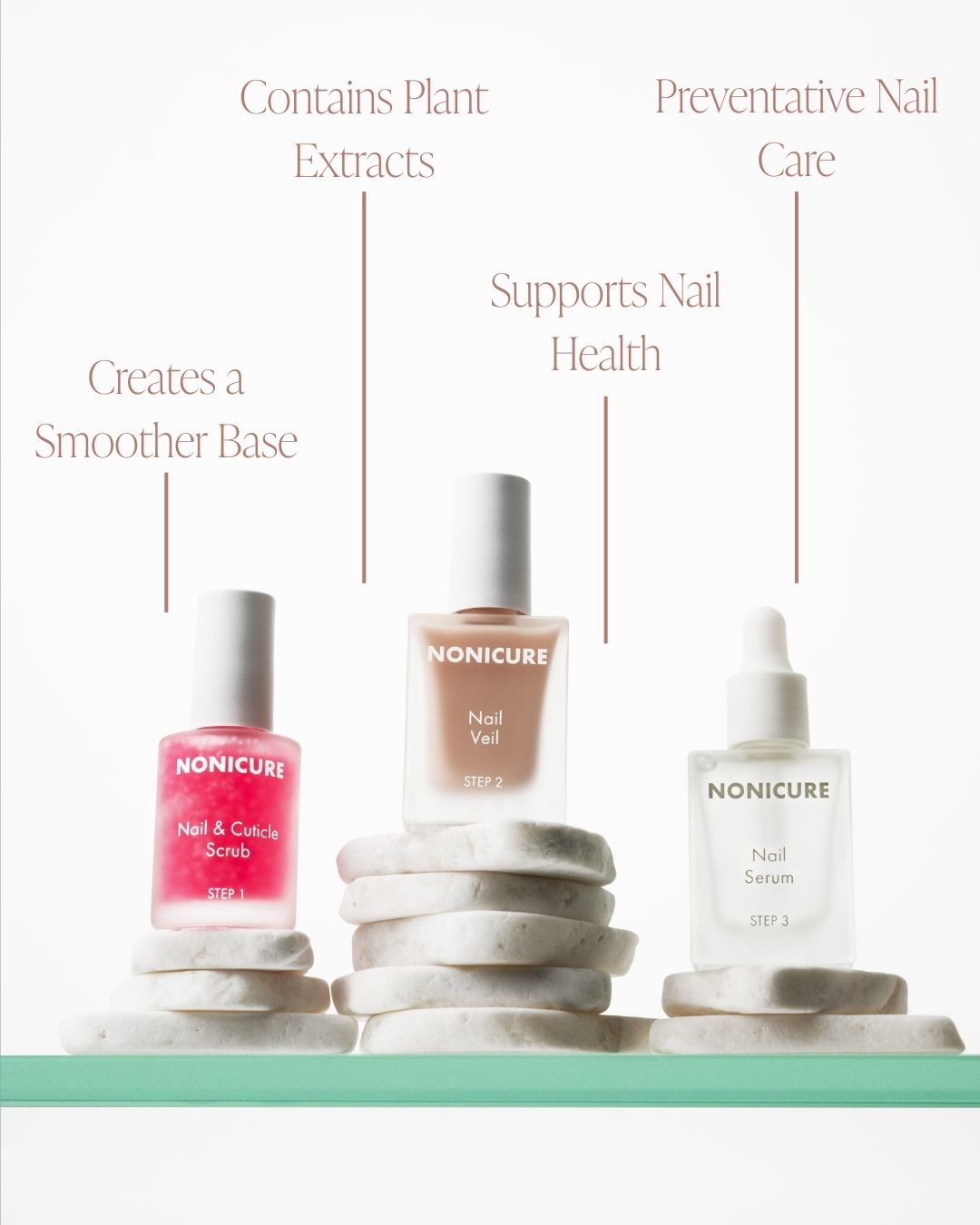 NoniCure is a complete 3-step nail care system designed to support healthier-looking nails before polish ever goes on. Inspired by skincare and created for real life, it helps smooth the nail surface, condition and support nail strength, and seal everything in with a breathable, glossy finish.